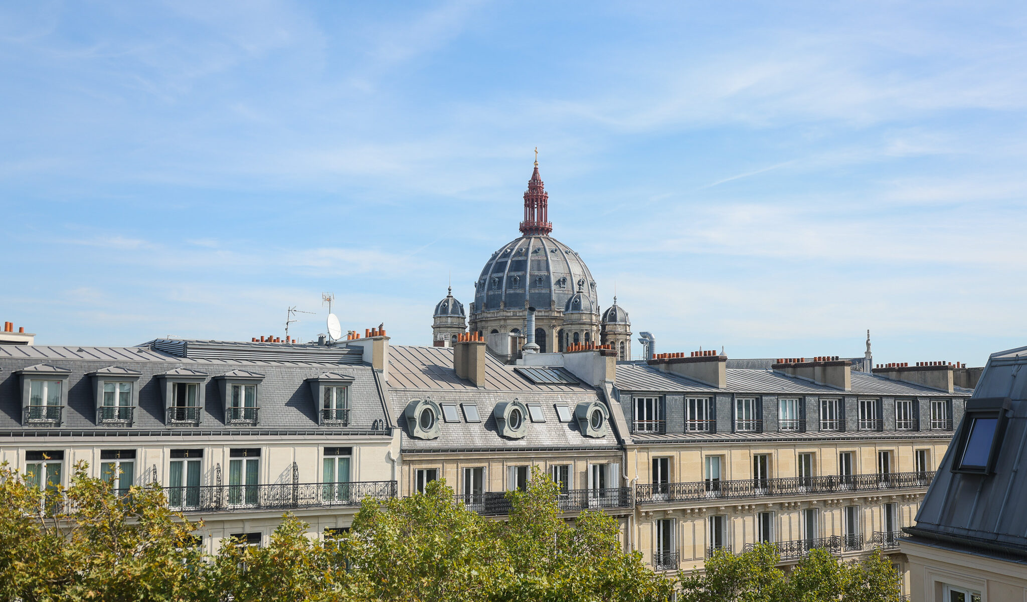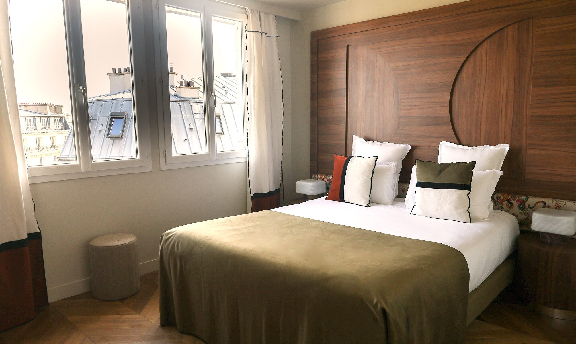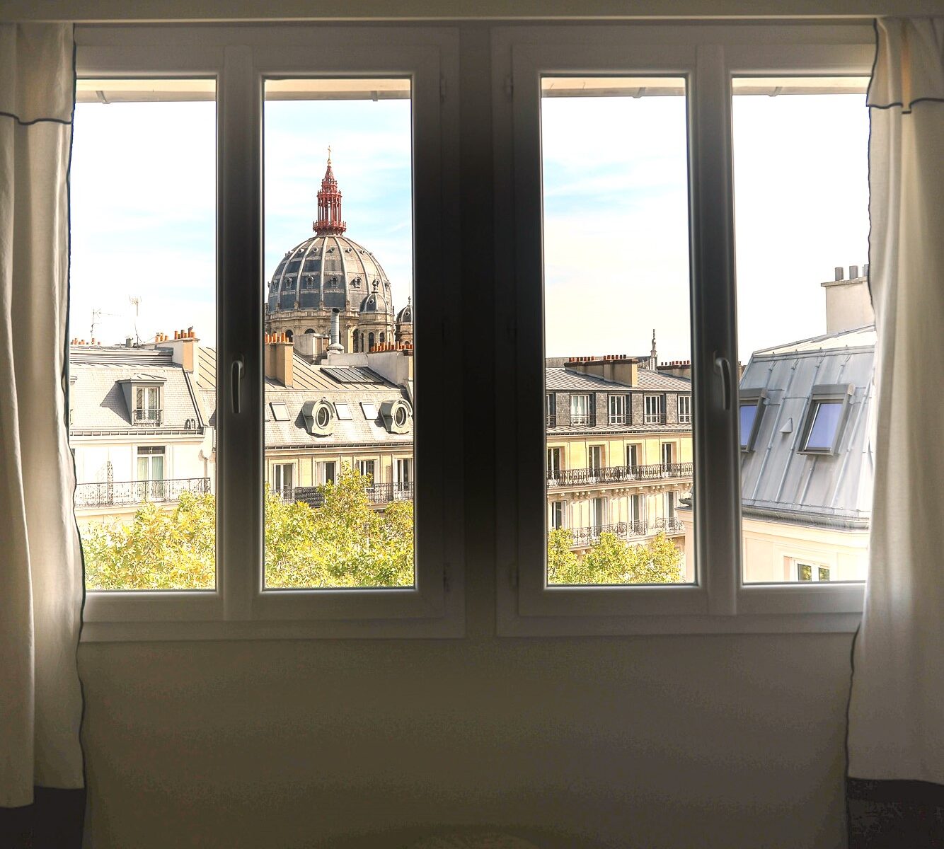Chambre double avec grand lit (160X200) et une magnifique vue dégagée sur les toits parisiens et sur l’église Saint-Augustin.